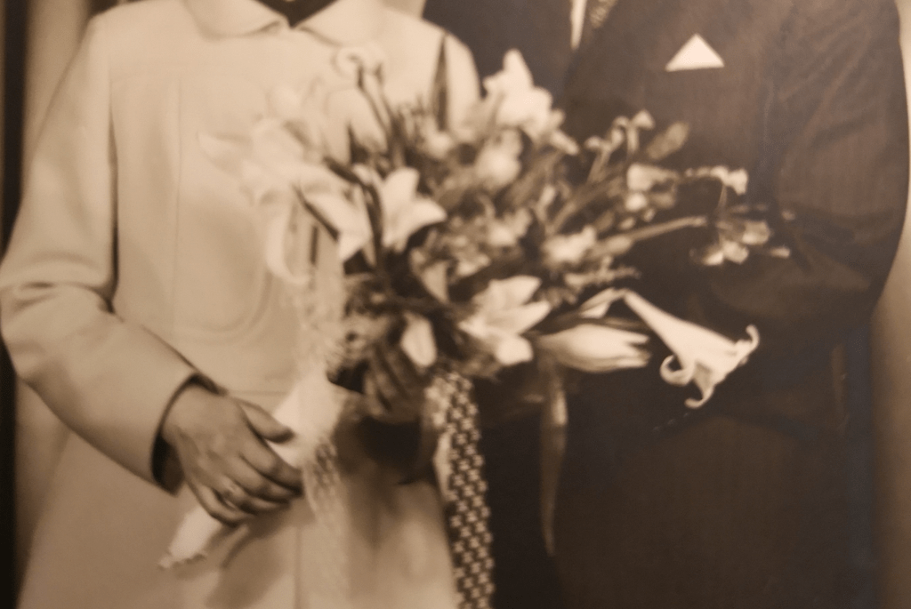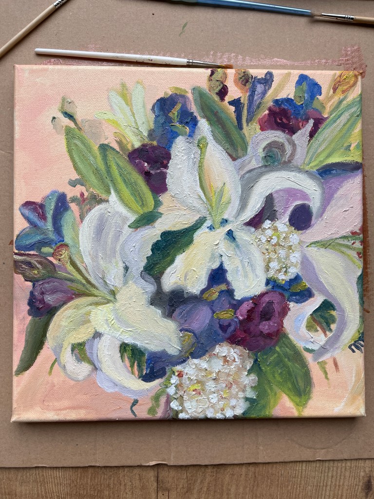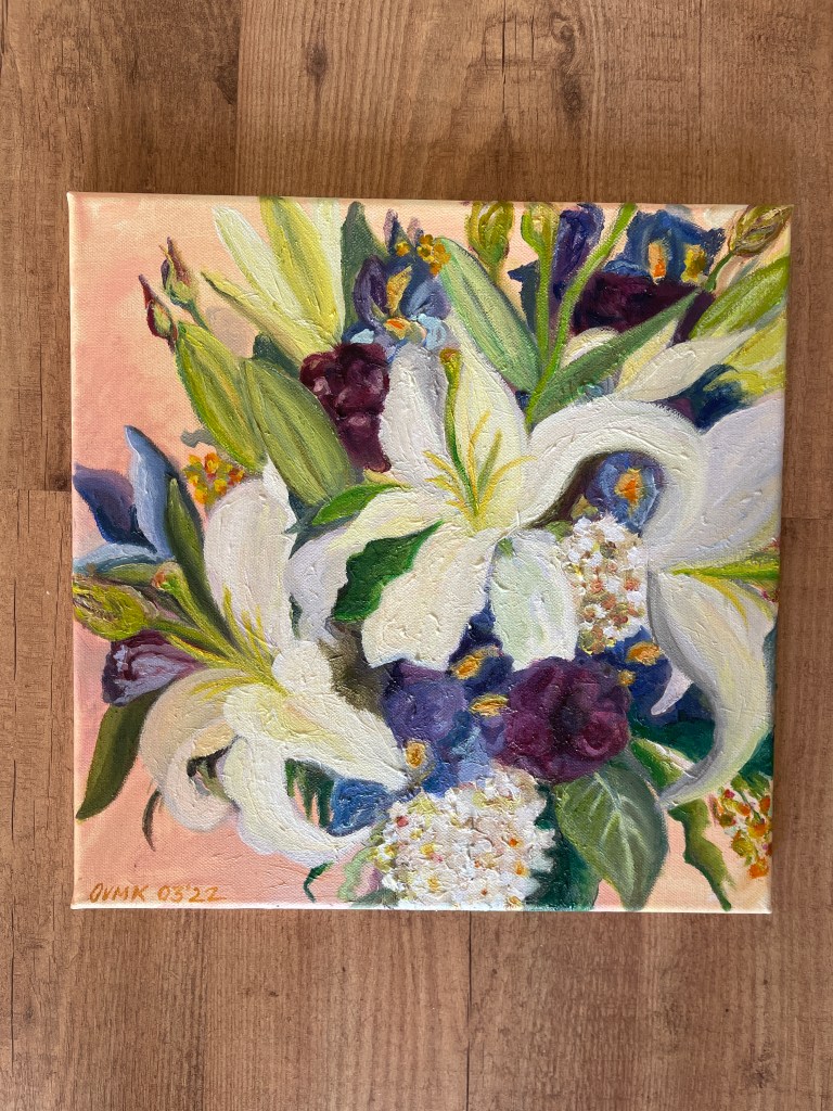 In 2020, after their 50th anniversary, my mother in law expressed one big wish – she wanted me to paint her a flower bouquet – not an arbitrary one – HER ONE! She asked me kindly to interpret the flower bouquet she held on her wedding day on March 26th, 1970 – 52 years ago!! Fun fact: she got another one than she ordered! She wanted lilies and blue gentian in a little round bouquet. But, she received a large long bouquet with lilies and irises instead … Something goes always wrong on special days – it’s a preassigned law ;)!