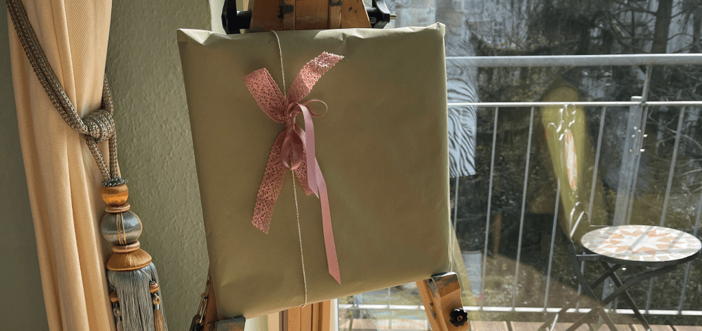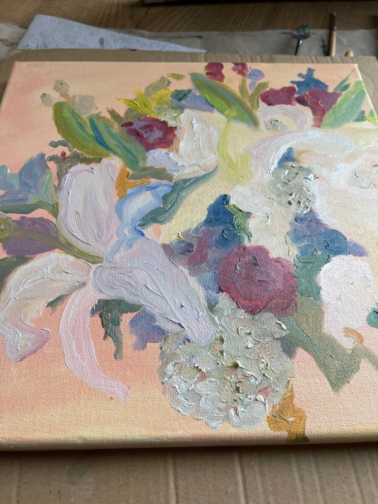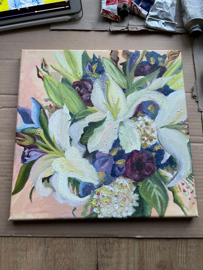OK … this means a real challenge – to bring that bouquet alive again – but “try first, and quit later” I thought by myself. I decided to use oil on canvas – I love how the layers develop their individual shades of spiritedness. Unfortunately, I had to interrupt the work on the painting many times by reason of more urgent projects at work and family issues – but 1 year and 3 months later, on March 27th , 2022 – the handover finally happened <3: